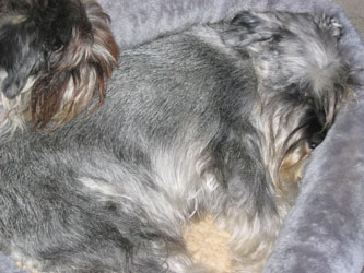 Flora grew up together with our three children. She attended a basic education course only but performed in a perfect way her role as a family member and escort dog. In the best sense of the word, she meets the definition, given by Hans Räber: Half tough Schnauzer - half cosy pet. Close to 13 years she was surprisingly fit and good looking. She was still enjoying her daily run, together with her mistress on bicycle. Over the time, she took on master of our mini-pack and played a marvellous role as a "grandma" for our D-litter. She cared for the puppies, put them in their place and taught them lessons. In doing so, she took every chance to catch some puppy-food, her most preferred goody. About her 13th birthday, we became aware of some detrimental alterations regarding her skin. A sample revealed the bitter fact: Breast cancer which had alraedy caused metastases on the skin. There where only a few weeks left to say good bye. Many thanks to the Dutch veterinary, the Roermond Crematorium and all our friends for supporting us and sharing our grief.